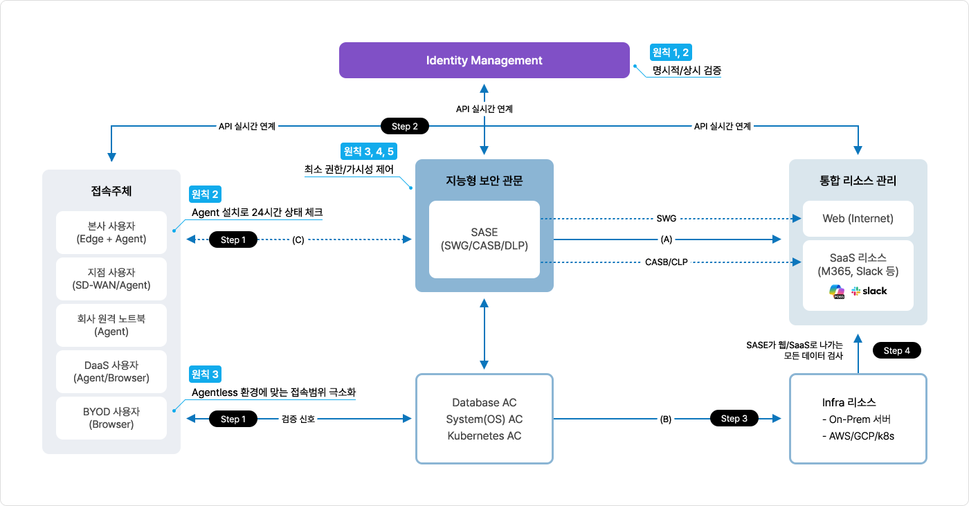 모든 접근 요청은 사용자 ID, 디바이스 상태, 위치 등 가용한 모든 데이터를 기반으로 인증하고 권한을 부여합니다.
