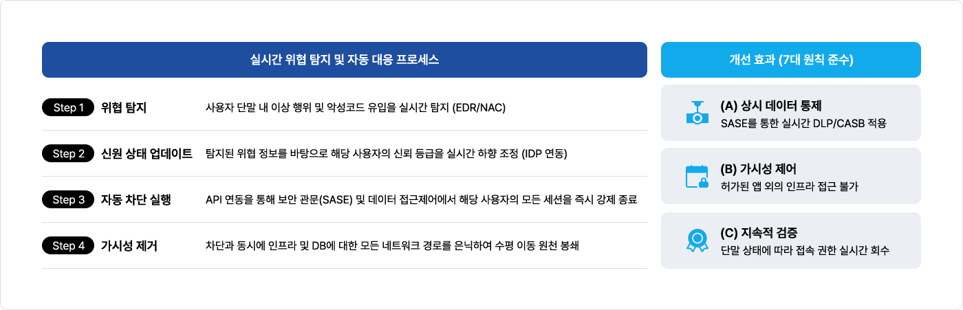 단말에서 문제가 생기면 그 신호가 즉시 보안 관문으로 전달되어, 관리자가 인지하기 전이라도 데이터로 가는 길을 먼저 끊어버리는 지능형 자동화 모델입니다.