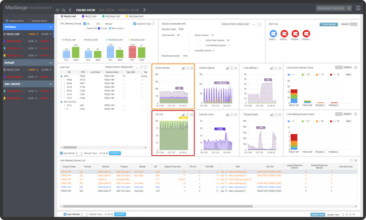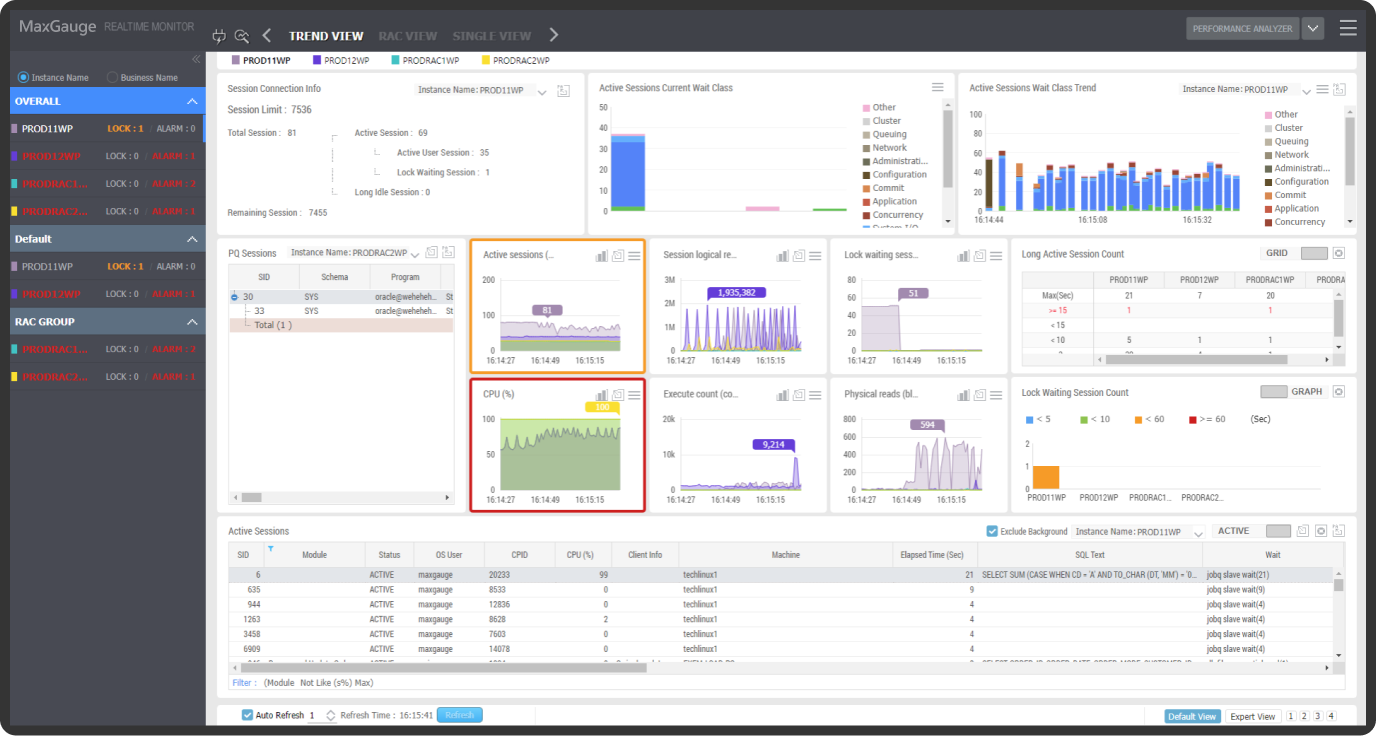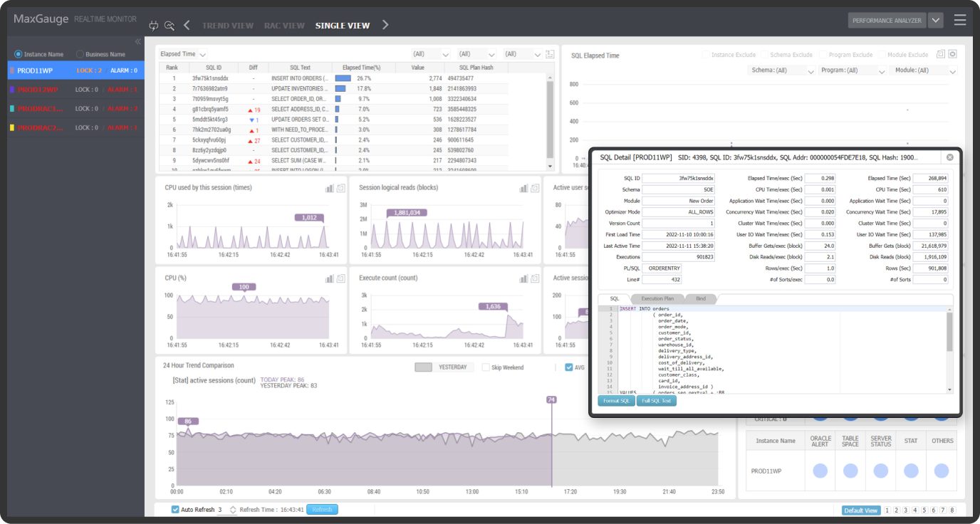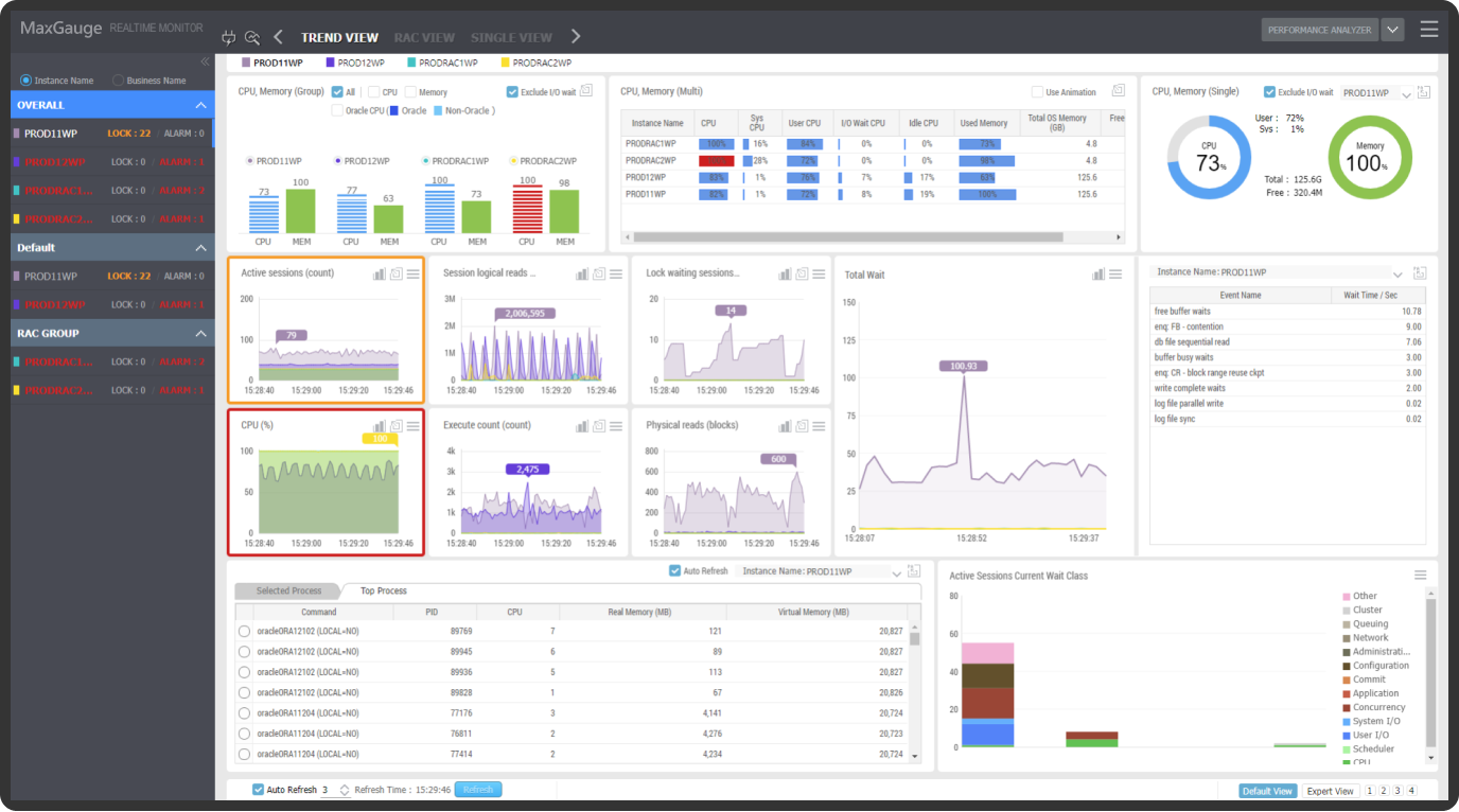 MaxGauge는 실시간 모니터링을 통해 감지된 문제점을 매우 상세하게 분석하는 기능을 제공합니다.