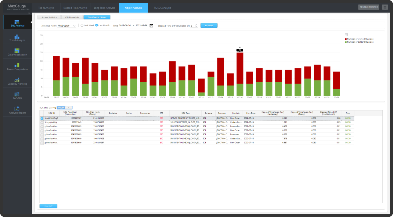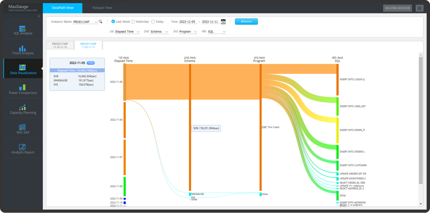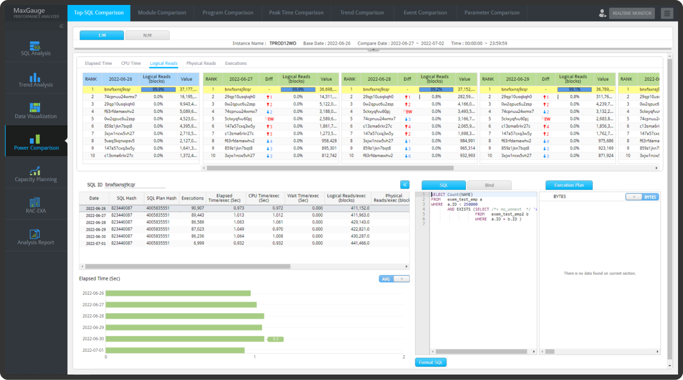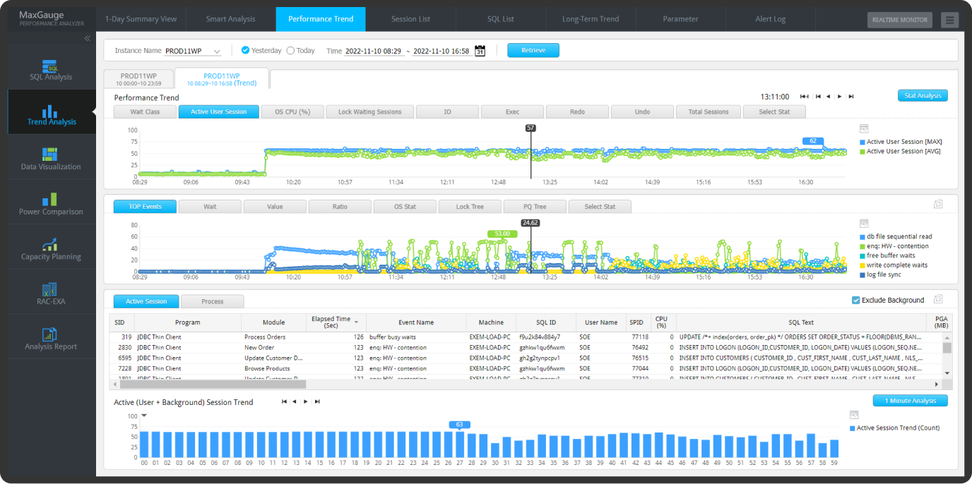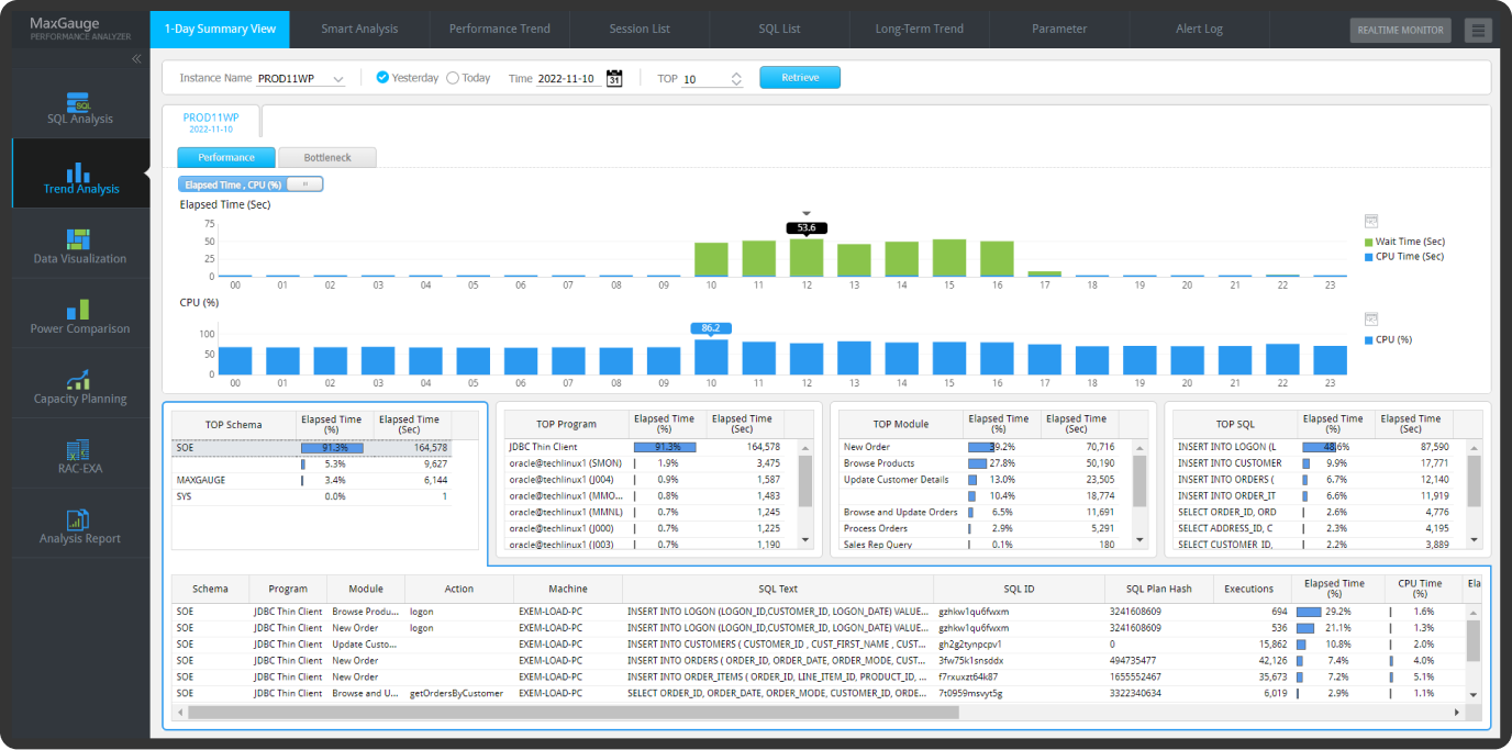 MaxGauge는 실시간 모니터링을 통해 감지된 문제점을 매우 상세하게 분석하는 기능을 제공합니다.