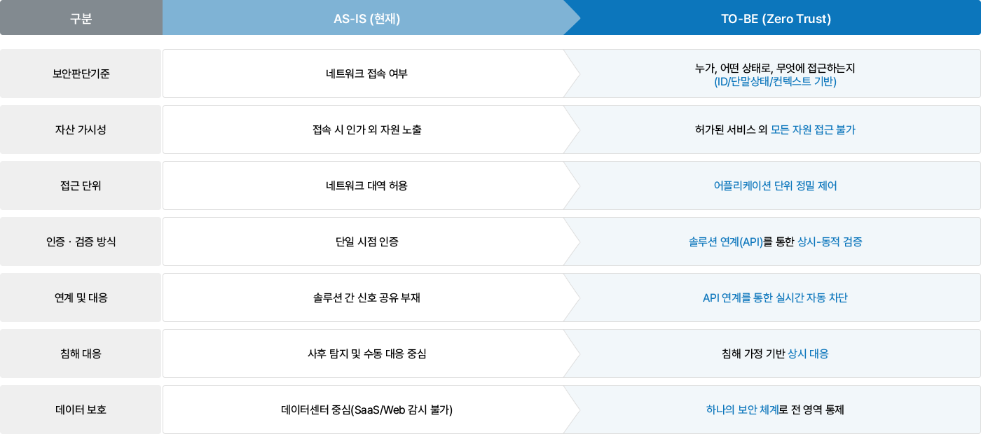 이미 침해가 발생했다고 가정하고 측면 이동을 제한하며, End-to-End 암호화와 지속적인 모니터링을 수행합니다.
