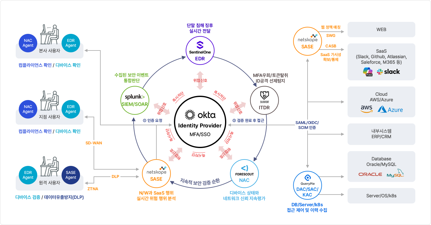EDR이 위협을 1초 만에 잡으면, 그 정보가 Okta를 거쳐 SASE와 통합 Access Control에 즉시 전달되어 모든 통로를 폐쇄합니다.